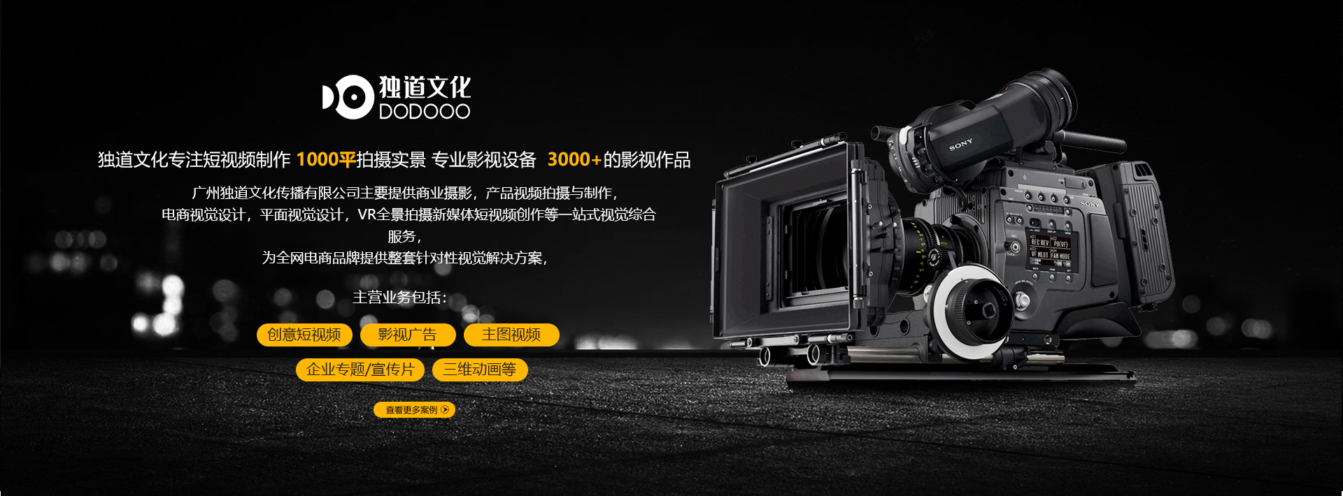 廣州獨(dú)道文化傳播有限公司主要提供商業(yè)攝影,產(chǎn)品視頻拍攝與制作,電商視覺(jué)設(shè)計(jì),平面視覺(jué)設(shè)計(jì),VR全景拍攝新媒體短視頻創(chuàng)作等一站式視覺(jué)綜合服務(wù),為全網(wǎng)電商品牌提供整套針對(duì)性視覺(jué)解決方案,